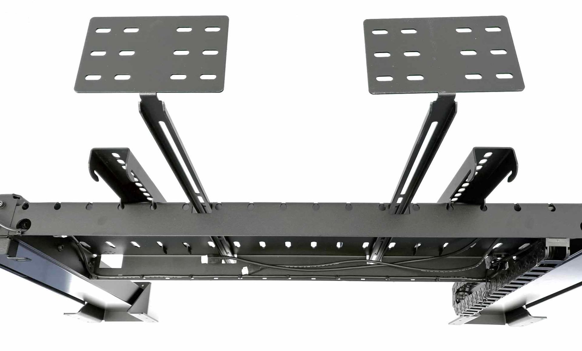Twin-Monitorlift mit zwei Hubsäulen. Das System hebt schwere Bildschirme mit einem Gewicht bis zu 120 kg. Das System ist konzipiert für interaktive Screens. Robust und schwingungsfrei.